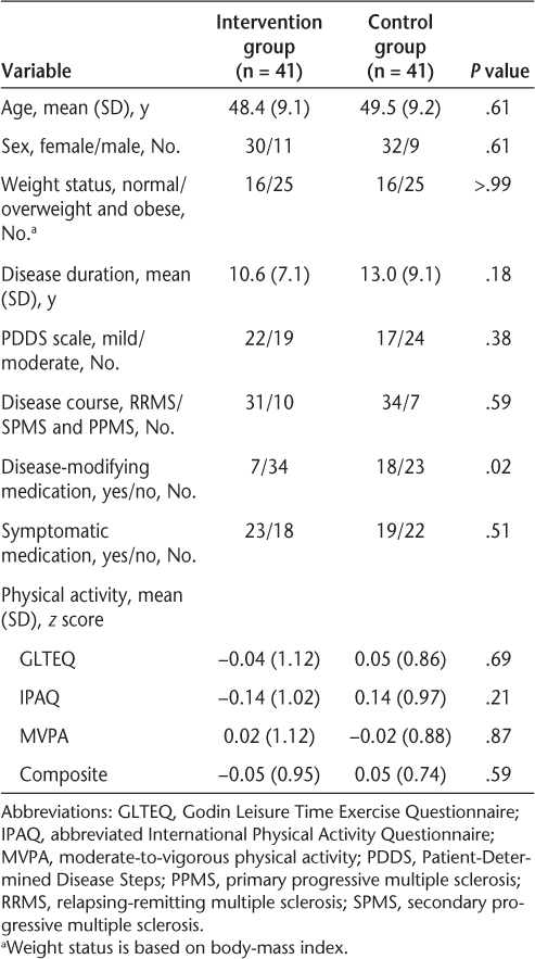 Methods: Eighty-two people with MS were randomly assigned to one of two conditions: behavioral intervention (n = 41) or waitlist control (n = 41). We collected information before the study on MS type, disability status, weight status based on body-mass index, and current medications. Furthermore, all participants completed the Godin Leisure Time Exercise Questionnaire and the abbreviated International Physical Activity Questionnaire and wore an accelerometer for 1 week to measure minutes of moderate-to-vigorous physical activity before and after the 6-month intervention period.