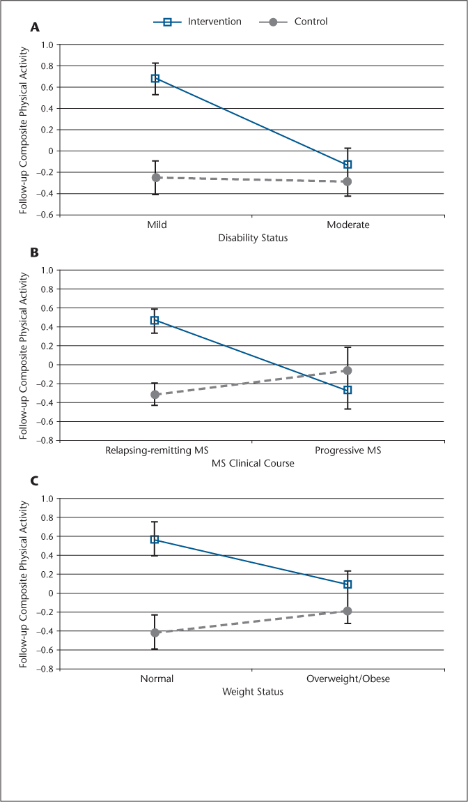 Effect of the behavioral intervention on physical activity based on disability status (A), clinical course of multiple sclerosis (MS) (B), and weight status (C)