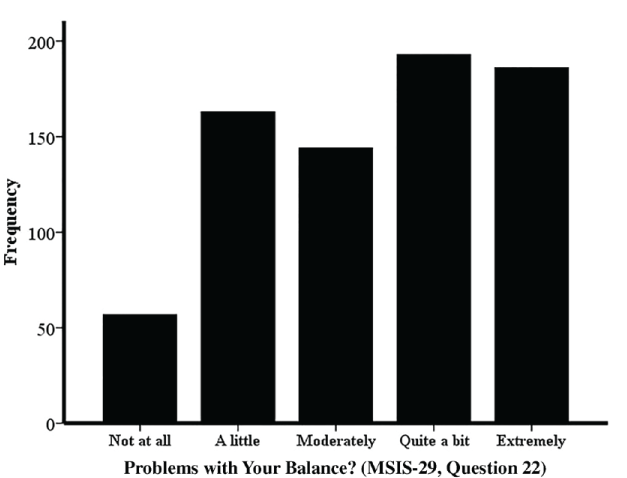 It is intuitive to think that safety in balance and mobility and lack of falls are integral to healthy aging with MS. However, there is little research examining the relationship between falls, balance, and health among older people with MS or people with higher degrees of MS-related disability. Grounded by qualitative findings, Ploughman and colleagues56 conducted the largest survey of health, lifestyle, and aging with MS in Canada. They recruited older people with MS (≥55 years of age) with symptoms for at least 20 years. Through Canadian MS clinics, MS Society chapters, and newspapers, 921 people were contacted and 743 surveys were returned.56 Participants ranged in age from 55 to 88 years, with a mean (±SD) age of 64.6 (±6.2) years and a mean duration of MS symptoms of 32.9 (±9.5) years. Although the researchers did not specifically ask participants about falls, survey respondents were asked about the extent of their balance problems (29-item Multiple Sclerosis Impact Scale, Question 22),57 their independence in activities of daily living (Barthel Index),58 and health-related quality of life (visual analogue scale). Over 70% of the sample reported moderate to extreme problems with balance (Figure 2). Severity of balance problems was inversely correlated with Barthel Index score (Pearson correlation −0.46, P < .0001; Figure 3) and with perceived health-related quality of life (using a 100-mm visual analogue scale; Pearson correlation −0.33, P < .0001; Figure 4).