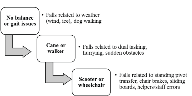 Based on clinical experience throughout the continuum of care and findings from qualitative research,54–56 we know that fall circumstances change as one ages with MS and depend on mobility level55 (Figure 1). During interviews with older people with MS, participants did not identify themselves as “fallers” or “at risk,” and they often viewed falls as both “routine” (“I fall all the time”) and yet “unexpected.” Using a qualitative research approach, researchers found that study participants, despite reporting problems with balance and falls, did not wish to use walking aids or wheelchairs.55 They explained that using these devices had two drawbacks from their points of view: first, canes, walkers, and wheelchairs were perceived as clear signs of disability that attracted sometimes unwanted attention from others; second, they considered the use of devices to be a sign of “giving up” or accommodating to MS. Participants felt that by using mobility aids, they would sacrifice potentially beneficial exercise effects of unaided (but often unsteady) walking on their balance and leg strength. Many participants described switching to a new gait aid reluctantly after a fall, sometimes at the insistence of concerned family members.
