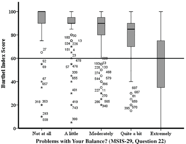 Relationship between balance difficulties and degree of disability measured with the Barthel Index