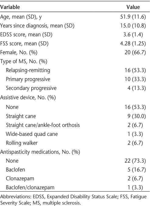 A convenience sample of 30 participants was recruited from an MS management practice in New York City where the first author worked as a physical therapist. After receipt of internal review board approval from St. Luke's Roosevelt Hospital, testing began with the first subjects who met the inclusion criteria and continued in an ongoing manner until recruitment was complete. Inclusion criteria included a) a clinical diagnosis of MS, b) ability to ambulate continuously for 6 minutes, with or without assistive devices, and c) ability to read and comprehend the informed consent form. Exclusion criteria included a) evidence of exacerbation as defined by the neurologist (patients were eligible to participate after 4 weeks of clinical stability), b) interferon injections within 48 hours of testing, c) recent treatment (within 4 weeks) with methylprednisolone, d) inability to ambulate for 6 minutes continuously, e) history of recent lower-extremity injury, cardiac problems, or respiratory complications interfering with the ability to perform a 6-minute continuous walk, f) use of antifatigue medications, and g) cognitive impairment that limited the ability to follow simple commands.