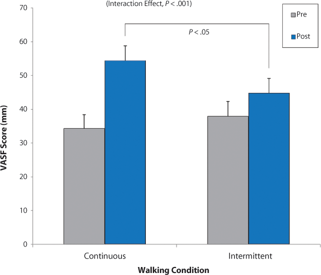Demographic and background sample characteristics are summarized in Table 1 and are consistent with those of the urban MS management practice from which subjects were recruited. All participants completed the study. As expected, the two-way repeated-measures ANOVA of the effects of Time (pretest vs. posttest) and Condition (continuous vs. intermittent walking) on VASF self-ratings of fatigue revealed two significant effects. First, the main effect of Time was significant (F = 36.65, P < .001), indicating that patients were more fatigued after walking than before walking, regardless of condition. This finding supports the use of 6 minutes of walking as a sample of exercise that can elicit fatigue. Most importantly, the interaction effect was significant (F = 16.54, P < .001), reflecting a greater increase in fatigue in the continuous-walking condition relative to that in the intermittent condition (Figure 1). Further supporting the main hypothesis, pairwise comparisons revealed a significant difference between conditions for postwalking VASF scores (P < .05) and not for prewalking VASF scores (P = .28). The latter finding reflects that patient fatigue was equivalent across days at the beginning of each session prior to walking. Pre-post mean VASF ratings increased from 34.33 mm to 54.43 mm (difference = 20.10 mm; 59%) in the continuous-walking condition, whereas they increased from 37.93 mm to 44.83 mm (difference = 6.90 mm; 18%) in the intermittent-walking condition. Clearly, fatigue increased less with rest breaks.