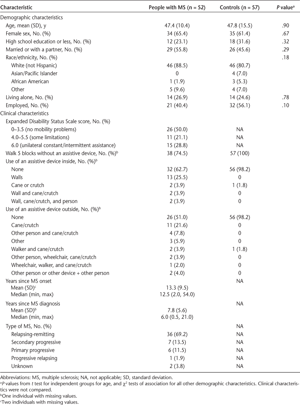Of people with MS, 50% had no ambulation problems (EDSS score = 0–3.5), 21% had some limitations but did not need assistance to ambulate (EDSS score = 4.0–5.5), and 29% needed unilateral constant or intermittent assistance from a device to ambulate (EDSS score = 6.0). Patients with MS were a mean (SD) of 13.3 (9.5) years post–symptom onset for MS and 7.8 (5.6) years postdiagnosis. Most of the participants with MS had relapsing-remitting MS (69.2%), followed by secondary progressive MS (13.7%), primary progressive MS (11.5%), and progressive relapsing MS (1.9%). Type of MS was unknown for two participants.
