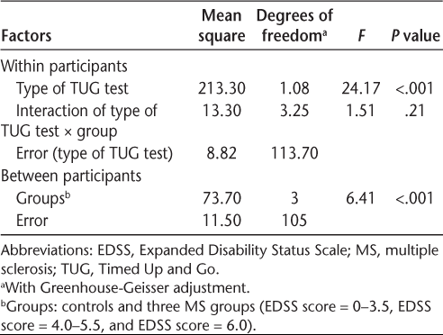 Descriptive analysis was performed for all demographic and clinical variables. Demographic characteristics between the MS and control groups were compared using the t test for age and χ2 tests for all other categorical variables. There were three main concerns before we analyzed the data on the TUG test: whether the sequence in which the conditions were applied influenced a subsequent test, whether there was a fatigue effect (later tests would have longer times), and whether learning effects were present (results of the second TUG trial of each type would be faster times due to a learning process). If we could assume that there was no effect of the sequence, that fatigue was not an issue, and that the learning effect was small or nonexistent, we could ignore the sequence of the trials and average the two values for each type of TUG test. We performed graphical analysis of the data by randomization order (data not shown but available on request) and found little influence of randomization order. Therefore, under those circumstances, we assumed that the averages of the two TUG tasks of each type were good estimators of the person's performance and analyzed the data using an analysis of variance for split-plot design (three conditions per person in each group), and the Greenhouse-Geisser adjustment for the degrees of freedom was used.