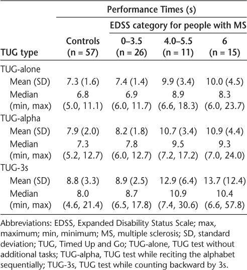 Table 2 shows the descriptive results for the three TUG tests for each group. In each group, there is an increase in mean and median times from TUG-alone to TUG-alpha to TUG-3s. In addition, within each type of test, the time increased from controls to increasing EDSS levels in the MS group.