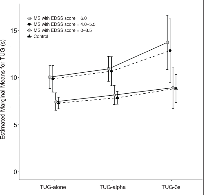Table 3 shows the statistical comparisons between groups and TUG types, which were tested by a split-plot analysis of variance. There was no effect of the interaction of group × TUG type (F 3.25, 113.70 = 1.51, P = .21), but there was an effect of group and TUG type (F 3, 105 = 6.41 and F 1.08, 113.70 = 24.17, P < .001 for both). Figure 1 shows the estimated means from the analysis of variance by TUG type and group. A post hoc analysis using Bonferroni adjustment showed that all pairwise comparisons for TUG type and for groups were significant (P < .001 for all). Comparing TUG types, there was an increase in the mean of 8.7 seconds to perform the TUG-alone to 9.4 seconds for the TUG-alpha (8% increase) and 11.1 seconds for the TUG-3s (28% increase). Comparing the groups, controls had an overall mean time of 8.0 seconds, followed by individuals with MS and no mobility problems with 8.2 seconds (a slight increase), those with MS and some mobility limitation with 11.1 seconds (39% increase), and those with constant/intermittent need for assistance with 11.6 seconds (45% increase). Post hoc analysis showed that controls did not differ from people with MS and no mobility problems (P > .99) but did differ from the other two groups (P = .04 and .003); people with MS and no mobility problems did not differ from people with MS and some limitations (P = .10) but did differ from the more severe MS group (P = .02); the two more severe groups did not differ from each other (P > .99). Figure 1 makes it clear that individuals with MS and no mobility problems have a TUG test performance that is similar to that of controls, with very little increase in time due to the addition of cognitive tasks to the TUG test. The two more severe groups perform similarly to each other, with a steeper increase in time to perform the test when the cognitive demand increases.
