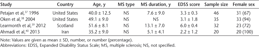 To be selected for this systematic review and meta-analysis, the study needed to 1) be published in English, 2) study a sample of people with MS, 3) be an RCT, 4) include anxiety as an outcome, 5) include supervised exercise in the intervention, 6) exclude any other additional therapies in the intervention, 7) include a nonactive control, and 8) have full text of the manuscript available (ie, we excluded conference abstracts).