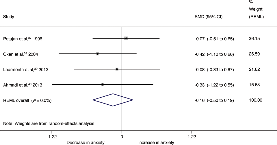Four RCTs with 133 participants were included. Exercise type included walking, aerobic activities, and cycling. Intervention duration ranged from 8 to 26 weeks. The pooled standardized mean difference in anxiety score was −0.16 (95% CI, −0.50 to 0.19), without heterogeneity. Two studies had high risk of bias, and two had some risk of bias.