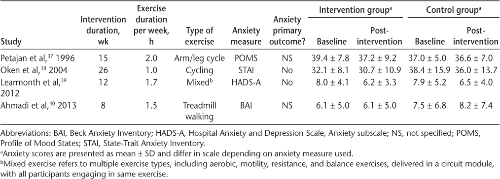 The study characteristics are summarized in Table 1. Two studies were performed in the United States,37,38 one in Scotland,39 and one in Iran.40 All the studies measured anxiety at baseline and immediately after the intervention, with either no information on whether this was the primary outcome or an indication that this was the secondary outcome. None of the studies selected participants based on anxiety level. Only one study measured anxiety 3 to 6 months after the intervention,39 preventing analysis of the effect of the long-term outcome. Intervention types included treadmill walking,40 cycling,38 and arm and leg cycling.37 One study had a combination of aerobic, resistance, and balance activities delivered in a circuit module.39 Further intervention and outcome characteristics, including outcome data, are described in Table 2.