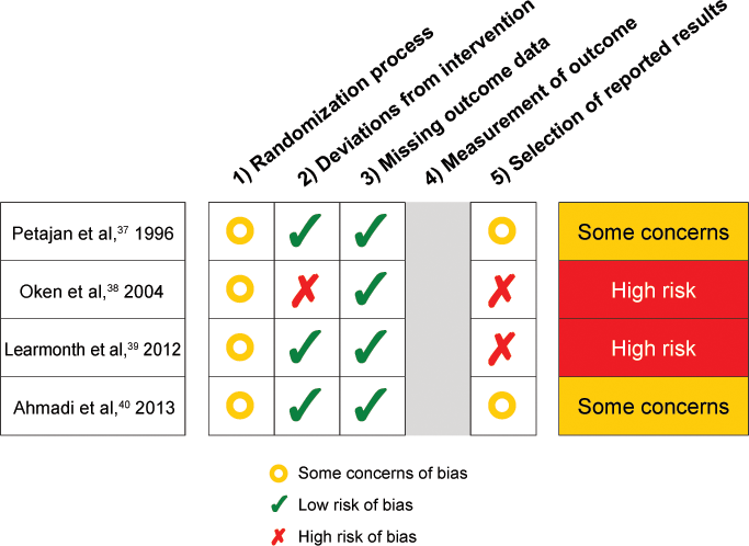 Two studies had some concerns of risk of bias overall,37,40 and two studies had high risk of bias overall (Figure 1).38,39 The weaknesses regarding bias arising from the randomization process were primarily due to lack of reporting. Stating that participants were randomized is not sufficient to fulfill the subdomain requiring that the allocation sequence was random. The issues regarding bias arising from selection of the reported results stemmed from a complete lack of prepublished or recorded study protocols from all included studies. Given that intended measurement of outcomes and intended analyses cannot be verified, we were not able to rule out whether selective reporting was occurring. One study reported anxiety and depression (as measured by HADS) as a combined score rather than as individual scores.39 In this instance, the author was contacted to retrieve raw data of the subscales that described depression and anxiety as separate constructs. This contributed to risk of bias in domain 5 of the Cochrane risk-of-bias tool, given that the outcome was potentially selectively reported as a single construct rather than as two independent constructs.