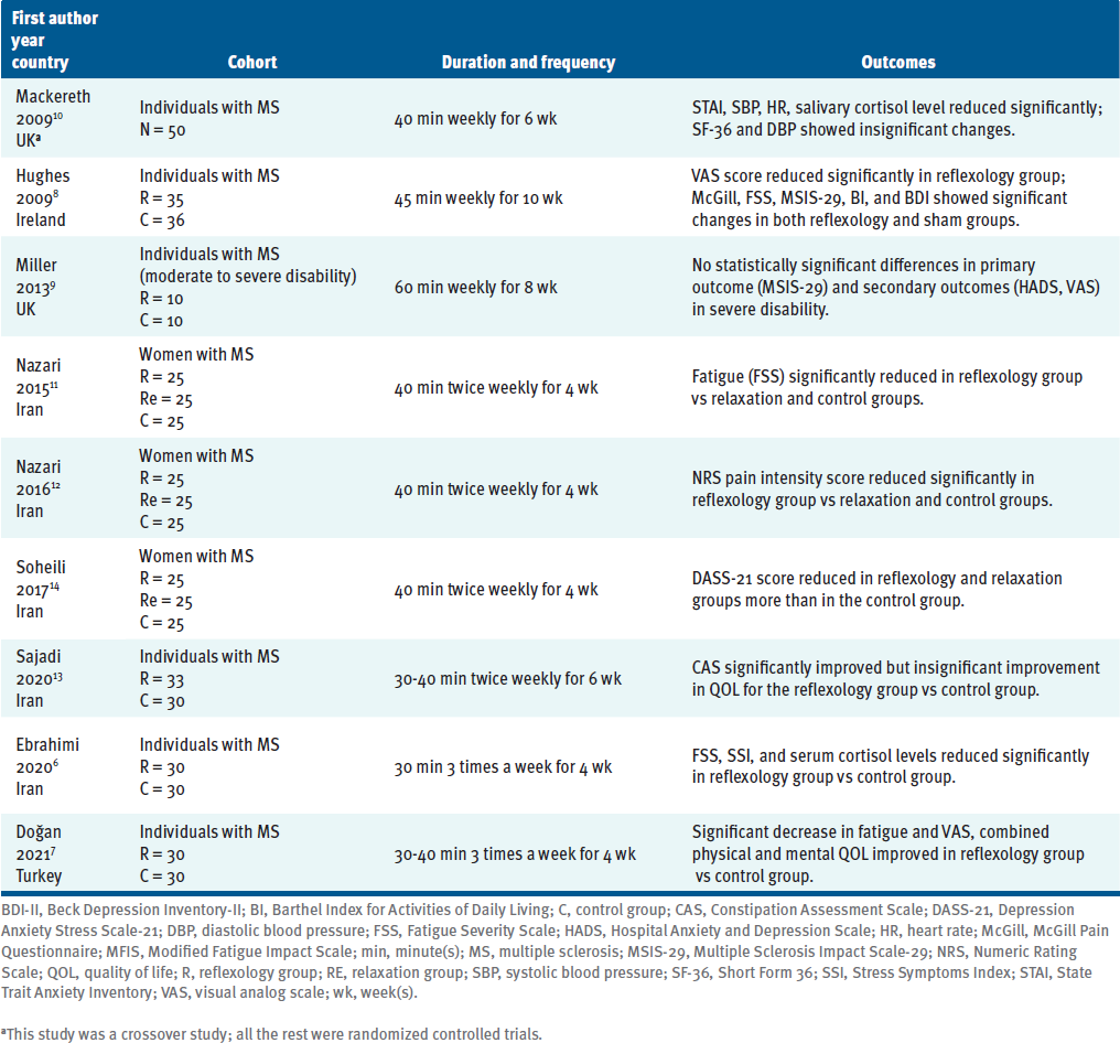 In the 9 studies included in this review, foot reflexology had a positive effect on the physical and mental health and quality of life of individuals with MS. None of the interventions had treatment-related significant adverse events. Therapeutic responses to reflexology in individuals with MS vary from person to person because severity and progression of disease are considerable13; however, the positive effects can be attributed to the type, depth, duration, and frequency of reflexology.