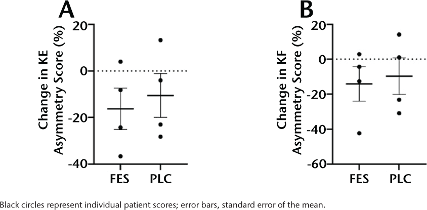 Mean Change in Knee Extensor (KE) (A) and Knee Flexor (KF) (B) Strength Asymmetry Scores for the Functional Electrical Stimulation (FES) Cycling and Passive Leg Cycling (PLC) Conditions