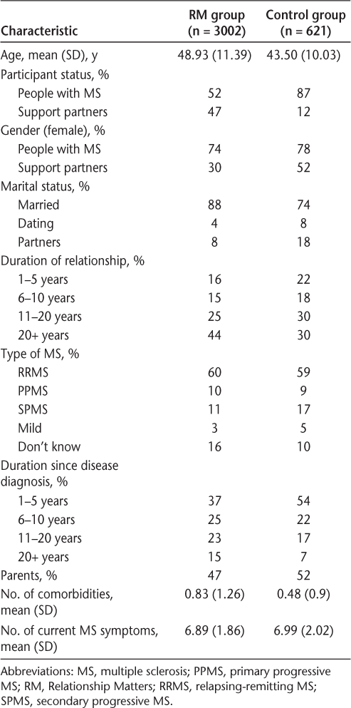 Relationship Matters program participants (n = 3002) were people with MS and their romantic support partners. Demographic data were collected for all participants (Table 1). Couples recruitment was conducted in each of the NMSS chapters. The RM sample reflected the gender difference in MS diagnosis, with 74% of the people with MS being female (Table 1). Of the RM participants, 83% (n = 2498) participated in a workshop format and 17% (n = 504) participated in a teleconference format. In year 3 of the 5-year demonstration grant, a relationship with the Multiple Sclerosis Society of Canada allowed collection of baseline and 3-month follow-up comparison data from 621 individuals who formed a control group. The Canada sample had larger overall numbers of women (78% of the total sample was female), as fewer support partners participated in the control group, leaving more people with MS in the Canadian sample (Table 1).