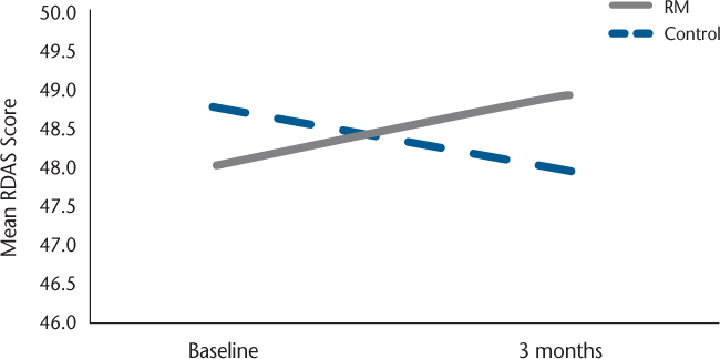 A 2 × 2 repeated-measures analysis of covariance (ANCOVA) controlling for baseline reported comorbidities with group (intervention [RM] or control) as the between-subjects factor and the two time points (baseline and 3 months) as the within-subjects factor revealed a significant interaction: F 1,469 = 5.89, P < .05, η2 = 0.01. As shown in Figure 1, RM participants experienced an increase in relationship satisfaction over time (from a mean [SD] of 48.06 [9.58] to 48.89 [8.61]; F 1,304 = 5.51, P < .05, η2 = 0.02), while control group participants experienced a decrease in such satisfaction (from a mean [SD] of 48.73 [9.08] to 47.96 [8.36]; F 1,166 = 3.10, P < .10, η2 = 0.02).