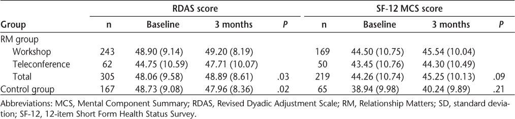 Mean (SD) RDAS and SF-12 MCS scores at baseline and 3 months for the RM (workshop and teleconference) and control group participants