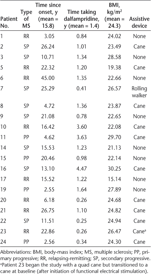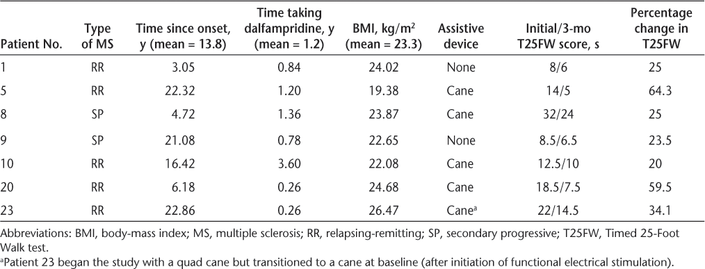 This was a small study with a population of convenience. Although the sample size was sufficient to produce statistically significant results, these results may be limited in their generalizability to a larger population. More studies are needed to examine these effects with larger groups and across varied populations. Another possible limitation of this study is that the participants were all taking a stable dose of dalfampridine. The effects of this pharmacologic intervention enhanced the gait performance of the participants. Although the FES intervention produced significant additional improvement, it is impossible to know what the effect of FES would have been had the participants been at their true, premedication baseline for gait ability. Although a truly blinded trial of FES is not possible owing to the clear physiological effect that cannot be masked, a randomized head-to-head comparison of FES versus dalfampridine might yield additional valuable information.