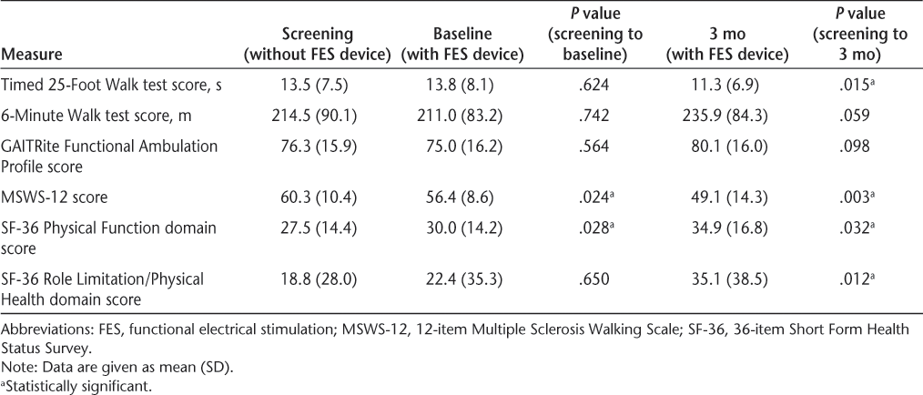 Methods: Participants demonstrating gait slowing and footdrop completed the Timed 25-Foot Walk (T25FW) test, 6-Minute Walk (6MW) test, GaitRite Functional Ambulation Profile, 12-item Multiple Sclerosis Walking Scale (MSWS-12), and 36-item Short Form Health Status Survey (SF-36) at screening without FES; the measures were repeated with FES at baseline, 1 month, and 3 months.