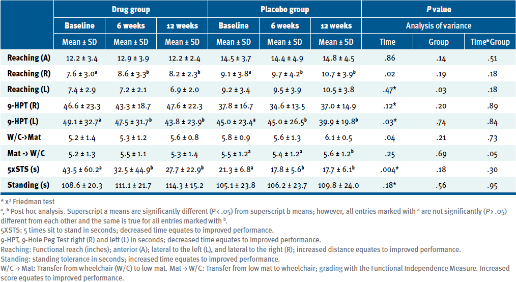 There was a significant time × group interaction for the Multiple Sclerosis Quality of Life-54 favoring the placebo group. Both groups significantly improved on the 9-Hole Peg Test (left arm only), sitting lateral reach (right), transferring from wheelchair to mat, and repeated sit to stand.