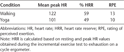 Descriptive statistics for exercise intensity (ie, HR and RPE) for treadmill walking exercise and yoga are provided in Table 2. Based on these data, participants were working approximately at the target moderate intensity (ie, 60% HRR) for the treadmill walking exercise and slightly below moderate intensity (ie, 49%) for the yoga session (Table 2). Mean peak RPE values reported in each condition were 13 in the walking condition and 10 in the yoga condition. Collectively, this indicates that the treadmill walking exercise and yoga conditions were performed at relatively moderate intensities (ie, HRR 40%–60% based on the American College of Sports Medicine physical activity guidelines).9
