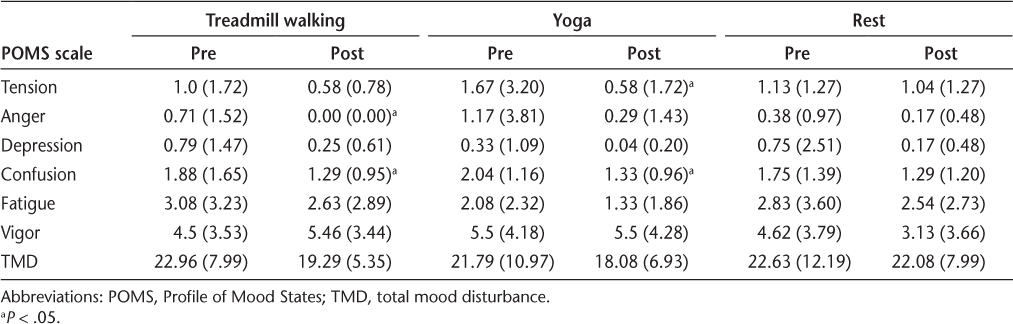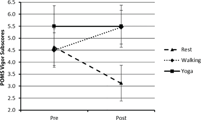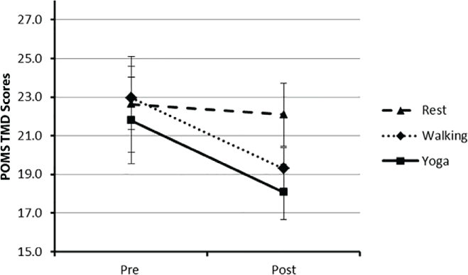 Results: There was a significant condition × time interaction on TMD scores (ηp 2 = 0.13). Walking and yoga conditions yielded comparable reductions in TMD scores. There was a significant condition × time interaction on vigor (ηp 2 = 0.23) whereby walking but not yoga yielded an improvement in vigor. There was a significant main effect of time on anger, confusion, depression, and tension (P < .05) but not on fatigue.