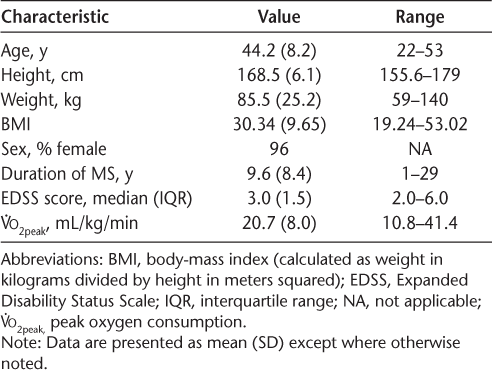 Demographic and clinical characteristics of the sample are provided in Table 1. The sample included 24 individuals (23 women [96%]; mean age, 44.2 years) with relapsing-remitting MS. The mean disease duration was 9.6 years, and the median EDSS score was 3.0, which reflects that, on average, the sample was fully ambulatory, with mild-to-moderate disability.29 The sample demonstrated a mean V̇o 2peak of 20.7 mL/kg/min. This value is similar to other samples of individuals with mild-to-moderate MS disability.27 33