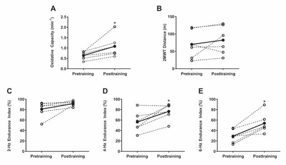 Participant characteristics are listed in Table 1. Nine people with MS were enrolled in the study: seven completed the 16 training sessions, and six participants completed all the posttraining testing sessions (Table 1). One participant performed two sessions a week for 9 weeks except for attending only one training session in weeks 5 and 9. Two participants dropped out of the study: one was injured in a car accident, causing a lapse in training, and the other experienced changes in resting blood pressure outside of appropriate study parameters. This participant was evaluated and cleared for training by a managing neurologist and a primary care physician after missing multiple sessions but did not meet the training criteria due to missed sessions. Across all antigravity treadmill training sessions, participants exercised at a mean ± SD of 55.2% ± 17.4% of their maximal heart rate (age-predicted) and reported an RPE of 5.0 ± 1.9. Treadmill walking speed ranged from 0.6 ± 0.2 mph to 1.0 ± 0.5 mph, and body weight support ranged from 36.3% ± 6.8% to 48.6% ± 3.5%. Posttraining measurements were obtained 5 to 9 days after the last day of training. Muscle oxidative capacity increased from 0.64 ± 0.19 min−1 to 1.08 ± 0.52 min−1 (68.2%; P < .05) (Figure 1A). No significant changes in walking function were found (Figure 1B). There was a main effect of treatment on muscle endurance of the gastrocnemius (P < .05), and endurance index increased from 80.9% ± 15.2% to 91.5% ± 4.8% at 2 Hz, from 56.3% ± 20.1% to 76.6% ± 15.8% at 4 Hz, and from 29.2% ± 13.1% to 53.9% ± 19.4% at 6 Hz of stimulation (Figure 1C–E).