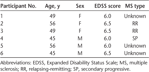 Criteria for enrollment included a diagnosis of MS, approval for participation in exercise training by a physician, an Expanded Disability Status Scale (EDSS) score of at least 6.0, and older than 18 years. Demographic information and type of MS were assessed using a self-report questionnaire, and level of disability was evaluated using the self-administered EDSS.24 The EDSS is commonly used to characterize disability in people with MS, and, by definition, those with EDSS scores greater than 6.0 have substantial ambulatory limitations and require the use of assistive devices. This study was approved by the Research Review Committee at Shepherd Center (Atlanta, GA), and all the participants gave written informed consent before participation.
