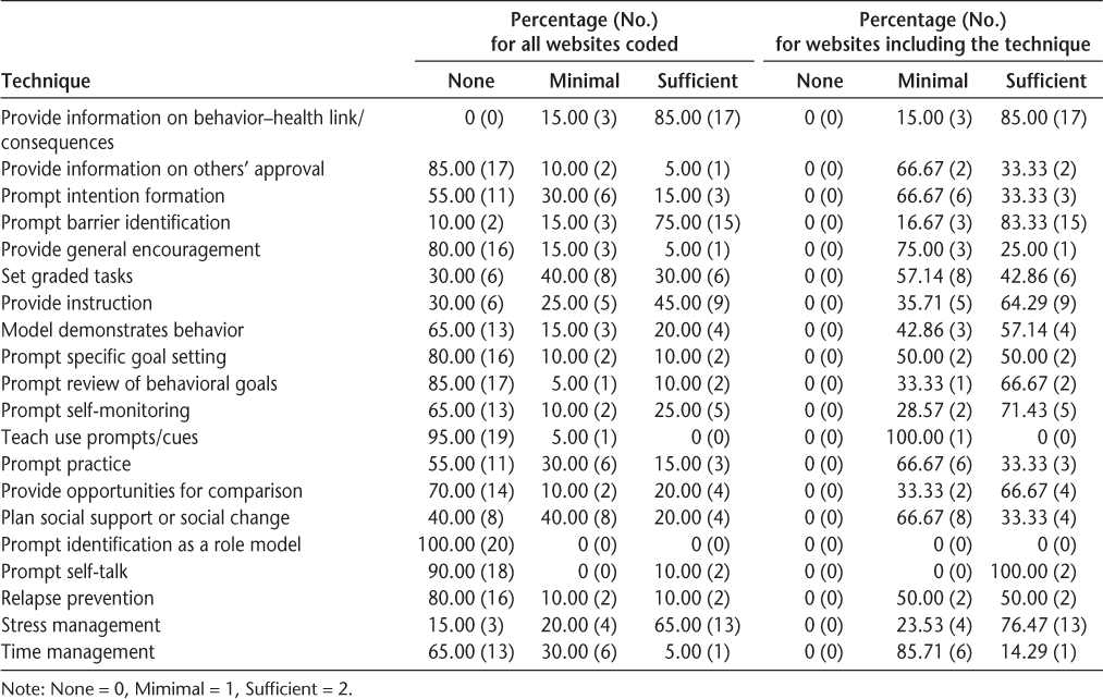 The coverage and quality of each behavior change technique was assessed. The coverage of behavior change techniques was coded as having no coverage = 0, minimal coverage = 1, or sufficient coverage = 2. Operational definitions for no, minimal, and sufficient coverage were adapted from a previous study examining health information on the Internet.19 A behavior change technique was coded as having no coverage if no information pertaining to this technique was provided on the website. If there was a superficial discussion of a particular behavior change technique, coverage was considered to be minimal. However, if there was ample discussion about the behavior change technique, coverage was considered sufficient. These codes were summed and divided by the number of behavior change techniques to obtain the mean for coverage, with higher numbers representing higher coverage.