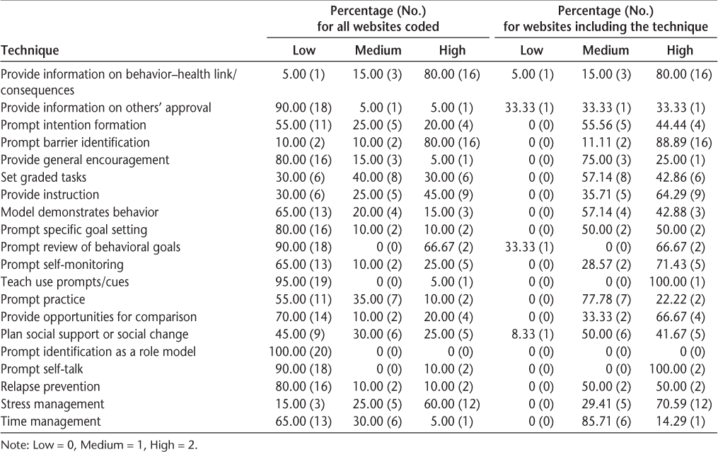 Methods: Using the taxonomy, 20 websites were coded for quality (ie, accuracy of information) and coverage (ie, completeness of information) of theoretical behavior change techniques.