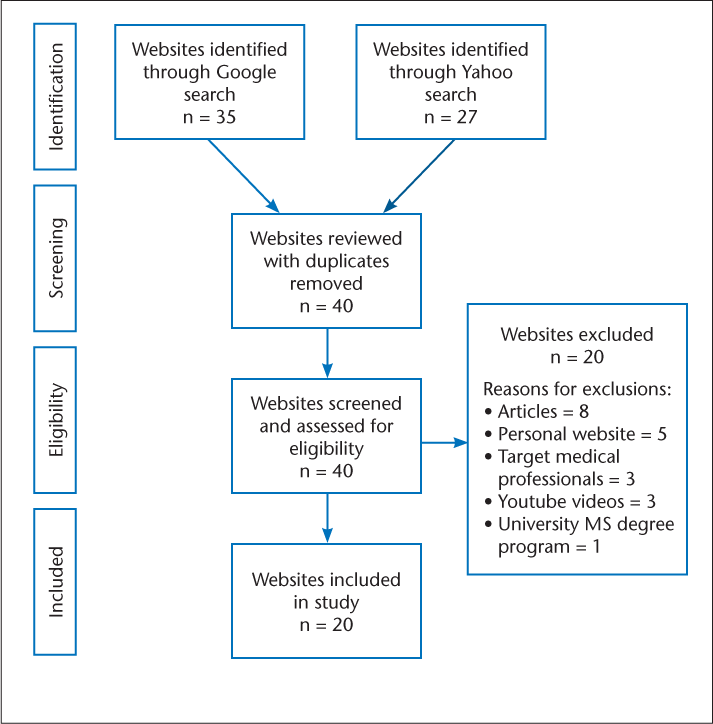 The initial search on both Google and Yahoo yielded a combined total of more than 2 million hits. Each link found on the first four pages of the search results was reviewed, resulting in 62 links (35 from Google and 27 from Yahoo). Of the 27 websites found using Yahoo, 22 were replications from the Google search. In total, 40 distinct websites were screened using the inclusion criteria, of which 20 were included in this study (Figure 1). Specific details regarding the websites can be obtained from the authors upon request.