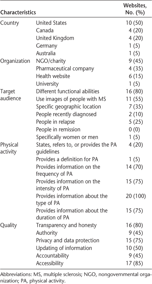The physical activity information presented on the websites examined mainly focused on the types of physical activities possible for people with MS, with all websites providing this information. The majority of the websites provided information about the suggested frequency (70%), intensity (75%), and duration (75%) of physical activities for people with MS. A small percentage of websites (20%) presented MS physical activity guidelines, and only one website provided a definition for physical activity (5%). The highest proportion of the websites belonged to nongovernmental (NGO) or charitable organizations (45%), half were from the United States (50%), and most used images of people with MS (55%) and targeted people with different functional abilities (80%). Less than half of the websites targeted people in a specific geographic location (35%), people recently diagnosed (10%), people in relapse (25%), or a specific gender (5%). None of the websites targeted people in remission.