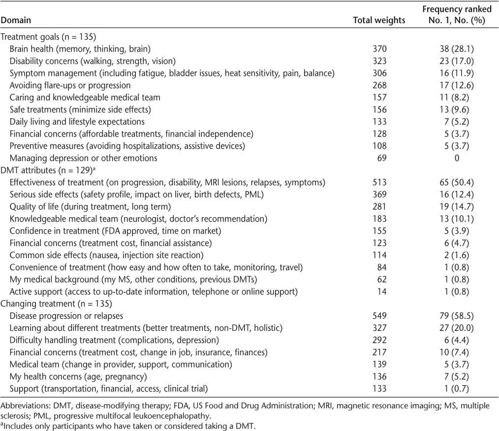 The rank ordering of domains observed in the present study was highly similar to that obtained in the referent (gold standard) study12 (Table S2 and Figure S1), for both treatment goals and DMT features.