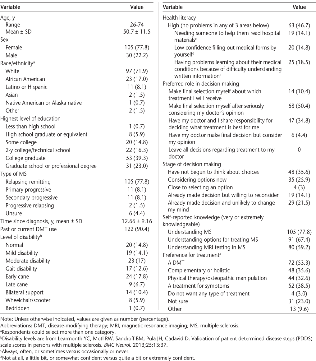 The patient sample (Table 1) seems to be representative of patients with prevalent MS, being similar to a representative study's sample (which was 72% female).15 Nearly all the participants preferred an autonomous or SDM role.