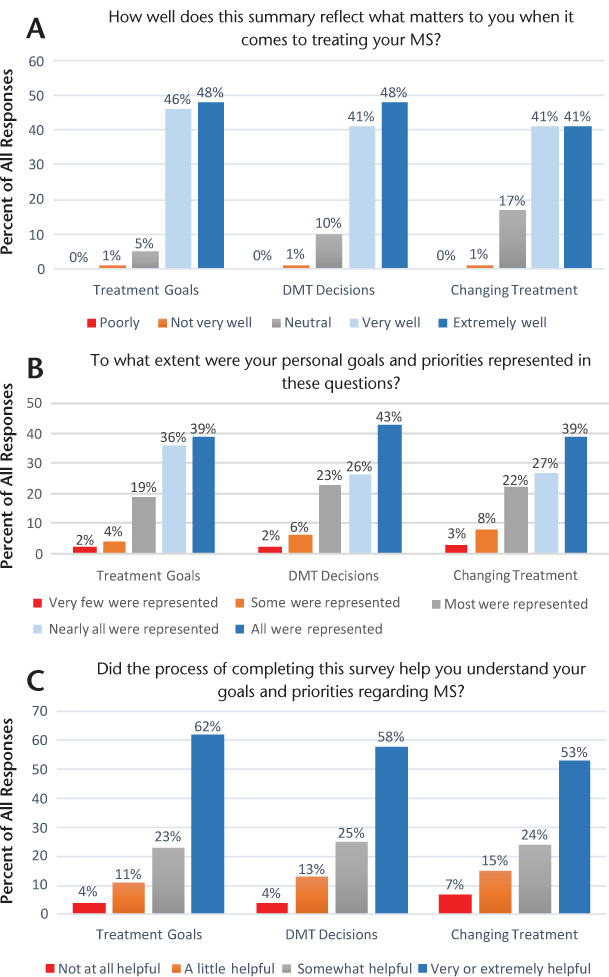 After viewing the summary of their prioritized preferences, nearly all the participants reported that the preference summary reflected what matters to them when it comes to treating their MS and represented their treatment goals “very well' or “extremely well” (Figure 2A). Nearly all the participants reported that most, nearly all, or all of their own goals and preferences were represented in the tool (Figure 2B). Most participants reported that the process of completing the tool was very or extremely helpful in understanding their goals and priorities regarding MS (Figure 2C).