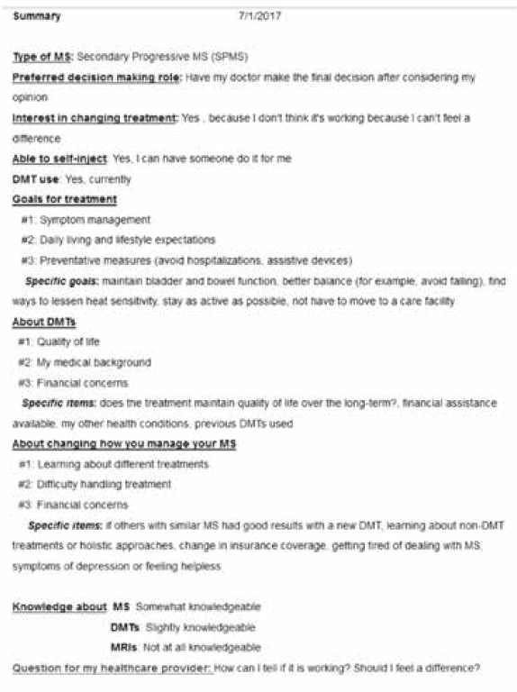 We developed a practical online tool that helps patients with MS clarify and summarize their treatment goals and preferences so that they can be shared more easily with their clinicians.