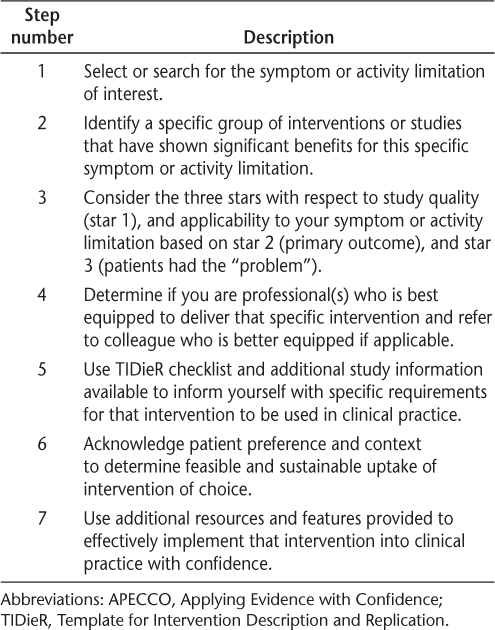 Health care professionals are recommended to follow a stepwise approach in using APPECO to reach an informed clinical decision based on the scientific evidence (Table 1).