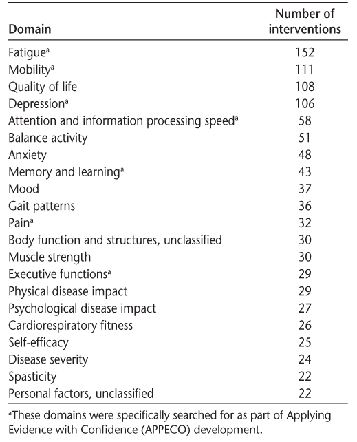 The APPECO platform includes details for 250 studies (as of February 2020) on the management of fatigue, cognitive dysfunction, depression, pain, and mobility in patients with MS.