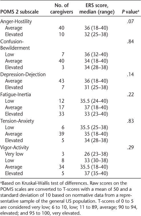 The POMS 2 is a 35-item, 5-point interval scale self-report questionnaire that was used to capture the caregiver's mood status during the past week.10 Previous work has indicated that the POMS 2 is a reliable and valid tool.11 For each item, higher scores indicate worse mood states: 0 (not at all) to 4 (extremely). Scores on each item are summed to generate a raw score. Raw scores are converted to T-scores with a mean of 50 and a standard deviation of 10 based on normative data from a representative sample of the general US population. T-scores of 0 to 5 are considered very low; 6 to 10, low; 11 to 89, average; 90 to 94, elevated; and 95 to 100, very elevated. The POMS subscales include Anger-Hostility, Confusion-Bewilderment, Depression-Dejection, Fatigue-Inertia, Tension-Anxiety, and Vigor-Activity.12 Friendliness may be captured as a separate item, although this was not evaluated in this study because the focus was on factors that may adversely affect empathy. The Total Mood Disturbance score is an index of overall distress that is obtained by summing all subscale scores minus the Vigor-Activity score. The ERS is a 10-item, 5-point interval scale that captures empathic responses toward the patient with a Cronbach internal consistency reliability estimate of α = 0.93.13 The ERS questions focus on the caregiver's perspective regarding empathic behaviors. Specifically, does the caregiver try to understand the patient's concerns and feelings, as well as the patient's perspective, and does the caregiver try to accept and assist the patient? For example, “I try to imagine myself in the patient's shoes” or “I try to comfort the patient by telling him or her about my positive feelings for him or her.” The ERS scores range from 0 (does not describe me well) to 4 (does describe me well).