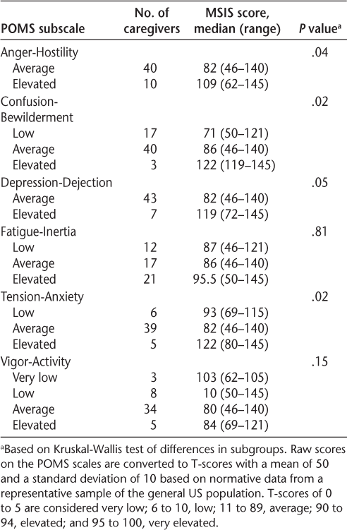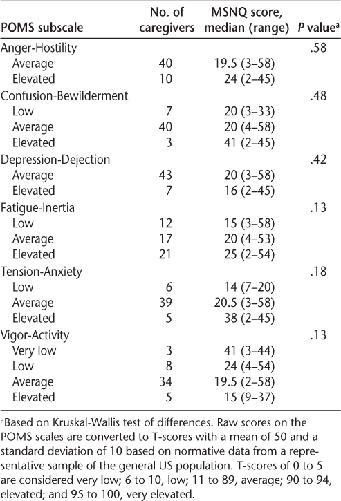 We also evaluated whether the patient's functional and cognitive status had a differential effect on the caregiver's psychological or emotional status (Tables 5 and 6). We found that greater functional impact of MS on patients (as perceived by caregivers) was associated with higher POMS total scores of caregivers (r = 0.32, P = .027). We also observed associations between POMS subscale scores and functional impact of MS. Elevated or very elevated scores on the Anger-Hostility, Depression-Dejection, Tension-Anxiety, and Confusion-Bewilderment subscales were associated with caregivers reporting that the person with MS experienced greater functional impact (Table 5). No differences were found in POMS subscale scores depending on the caregiver's report of the patient's cognitive status (Table 6).