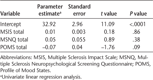The MSIS-2914 15 is a 29-item scale that was used to capture the caregiver's perception of the functional impact of MS on the day-to-day life of the person for whom they were providing care. When used with proxy respondents, the Cronbach reliability estimate was α > 0.96, with high scale test-retest reliability (interrater correlation coefficient of 0.87). The MSIS-29 has moderate internal validity, with an intercorrelation of 0.65.15 The caregiver's perception of the patient's cognitive deficits was captured using the MSNQ, a 15-item instrument that is a valid, sensitive measure of cognitive impairment in MS when completed by proxy respondents. It has high internal consistency reliability (Cronbach α < 0.91) when used with family proxies.16 17