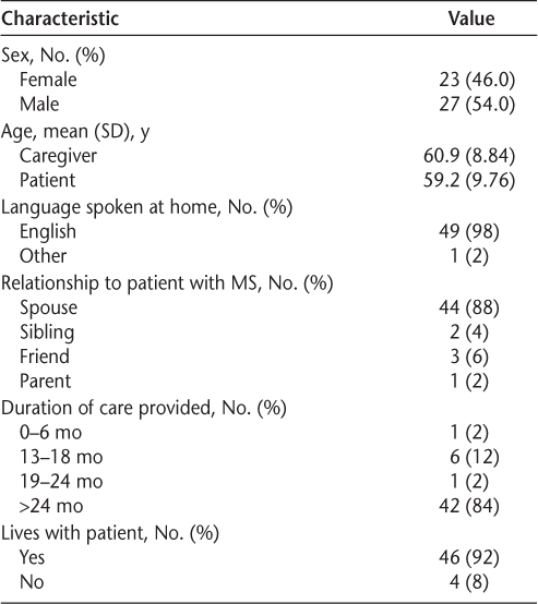 Of the 50 caregiver participants, 23 (46%) were women. The mean (SD) age of caregivers was 60.9 (8.84) years and of individuals with MS was 59.2 (9.76) years. Most caregivers were the spouse of the patient, lived with the patient, and had cared for the patient for more than 24 months (Table 1).