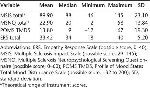 After informed consent was obtained, a research assistant provided the study instruments to the family caregiver participant. The instruments included a brief investigator-developed demographic tool with questions about the family caregiver's sex, language spoken at home, relationship to the person with MS, how long they had been the caregiver, and if they lived or did not live with the patient; the Profile of Mood States 2nd Edition (POMS 2)10–12; the Empathic Responding Scale (ERS)13; the 29-item Multiple Sclerosis Impact Scale (MSIS-29)14 15; and the Multiple Sclerosis Neuropsychological Screening Questionnaire (MSNQ).16 17