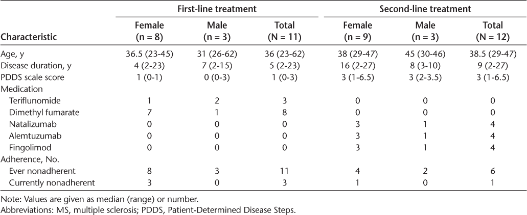 Differences between people with MS receiving first- and second-line treatment in disease activity and drug characteristics are also likely to influence adherence rates,17 but so far no study has explored first- and second-line treatment adherence characteristics. The aim of the present study was to investigate factors influencing treatment adherence and nonadherence in people with MS receiving either first- or second-line treatment.