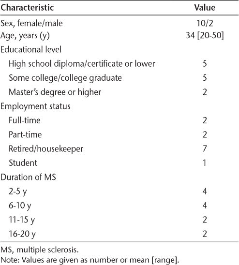 Twelve people with MS participated in this study: 10 women and 2 men (mean age, 34 years). They had lived with MS for 8.5 years on average. Table 1 provides demographic information about the participants.