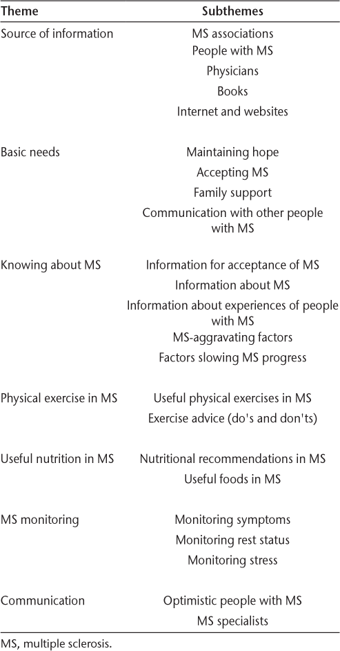 The analysis resulted in the emergence of 7 themes: the source of information, basic needs, understanding MS, physical exercises in MS, useful nutrition in MS, MS monitoring, and communication. Within these 7 themes we identified 23 subthemes.