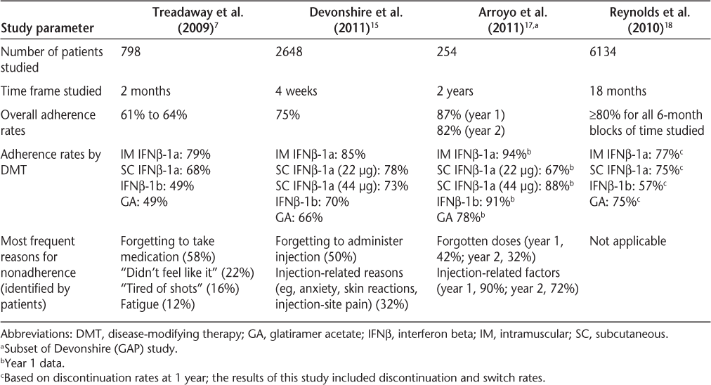 Caon C, Saunders C, Smrtka J, Baxter N, Shoemaker J. Injectable disease-modifying therapy for relapsing-remitting multiple sclerosis: a review of adherence data. J Neurosci Nurs. 2010;42(5 suppl):S5–S9.