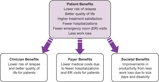 There are numerous benefits associated with treatment adherence that extend beyond a lower risk of clinical and radiographic relapses and reduced disability progression. Adherence to medication corresponds with lower rates of emergency room visits, hospital stays, and absences from work. These factors can significantly affect patient quality of life and treatment outcomes. Benefits for health-care providers, payers, and society at large, such as diminished costs and increased productivity, have also been associated with patient adherence (Figure 1). In a recent large (N = 2446) study on the impact of adherence to DMTs on clinical and economic outcomes in MS, the adherent group was significantly less likely to be hospitalized for MS-related reasons or to experience relapses than was the nonadherent group (with nonadherence defined as <80% medication possession ratio); adherent patients also incurred lower medical costs overall.6 Research in patients with MS has shown that higher rates of adherence are linked to a lower risk of severe relapse8 and that longer gaps (>90 days) during which individuals are nonadherent are linked to a higher risk of severe relapse.9 Post hoc analysis of cumulative dose and cumulative time on treatment in a long-term follow-up study of patients with relapsing-remitting MS (RRMS) who received subcutaneous (SC) interferon beta-1a (IFNb-1a) suggested that high exposure to this DMT may be associated with better clinical outcomes in MS patients than low exposure. The authors emphasized the importance of medication adherence in light of these findings.10