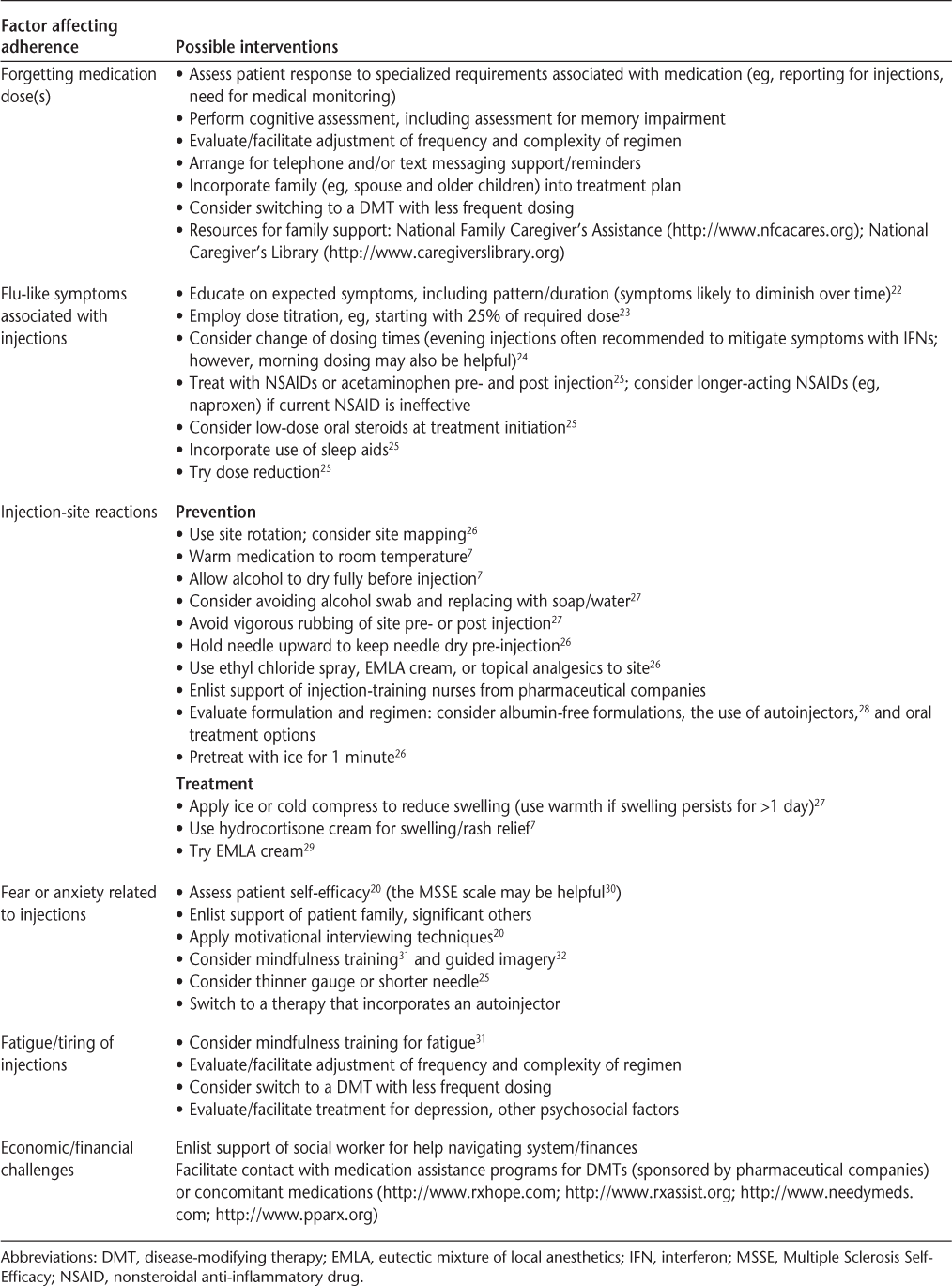 Data from clinical trials have identified myriad factors affecting adherence that are specific to patients with MS, including neuropsychological issues, patient self-efficacy, duration of disease and treatment (with shorter durations associated with greater adherence), issues associated with reduced quality of life, and patient perceptions of benefits and risks.20 The economic burden experienced by patients must also be evaluated on a case-by-case basis. Even seemingly subtle nuances of insurance plans can have a negative effect on adherence. One study found that the 10% increase in cost sharing required of patients who paid coinsurance (as opposed to copayments) for DMTs was associated with a decrease in adherence rates of nearly 9%.21 Table 2 summarizes potential interventions for factors commonly cited as affecting adherence.