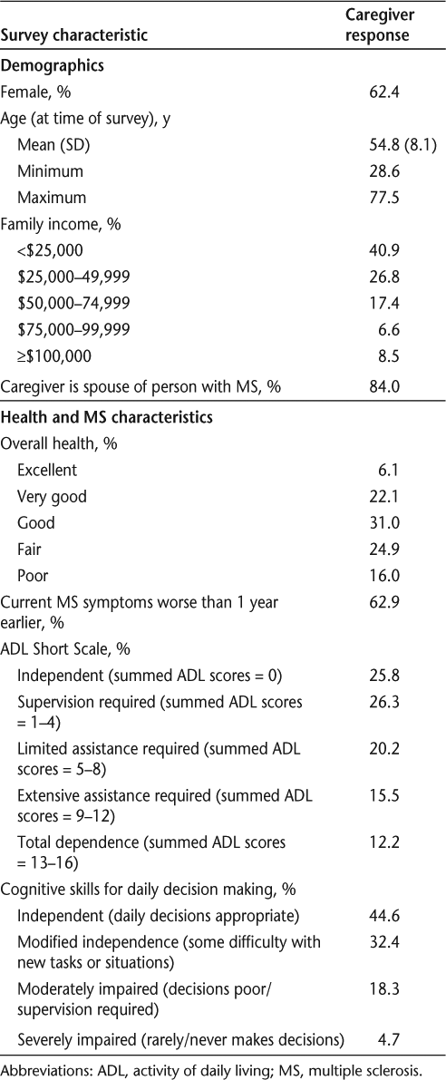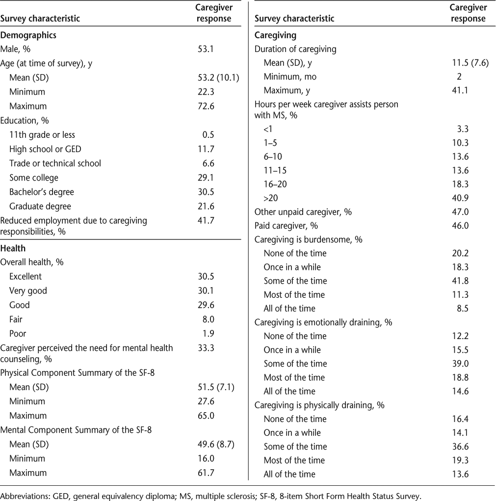 The interviewer asked caregivers to provide the average number of hours they spent each week assisting the person with MS to cope with the impact of MS on daily life. Interviewers asked the caregivers if paid caregivers or other unpaid caregivers also helped the person with MS cope with the impact of MS. Interviewers read a list of statements assessing a range of feelings that caregivers may have experienced when assisting the person with MS, including “caregiving is burdensome,” “caregiving is emotionally draining,” and “caregiving strained or threatened the caregiver/care recipient relationship.” These caregiver feelings were measured using a 5-point Likert item, with possible responses of none of the time, once in a while, some of the time, most of the time, and all of the time. The caregivers were asked if they needed or would have benefited from treatment from a mental health professional in the previous 12 months.